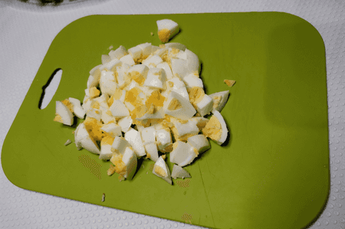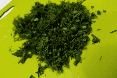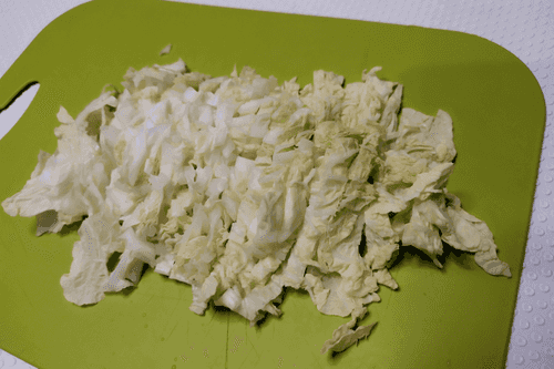 Мелко порубить зеленую часть листьев пекинской капусты.