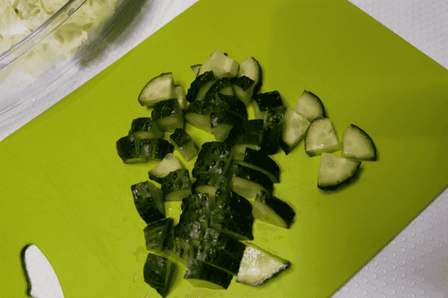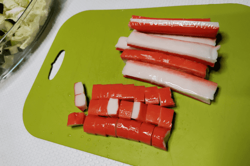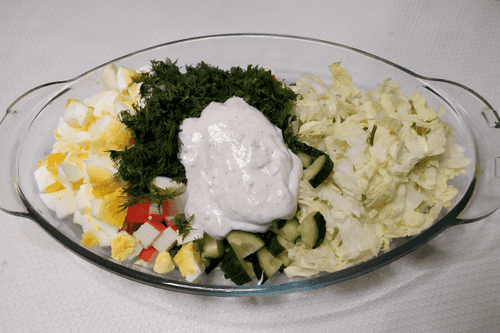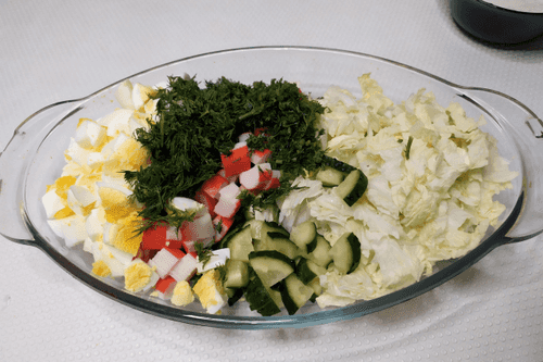 Соединить в салатнике крабовые палочки, яйца, овощи и зелень.