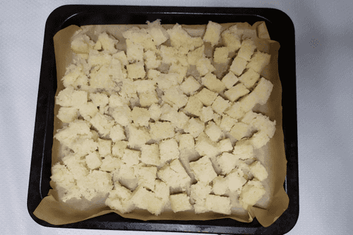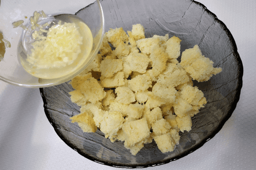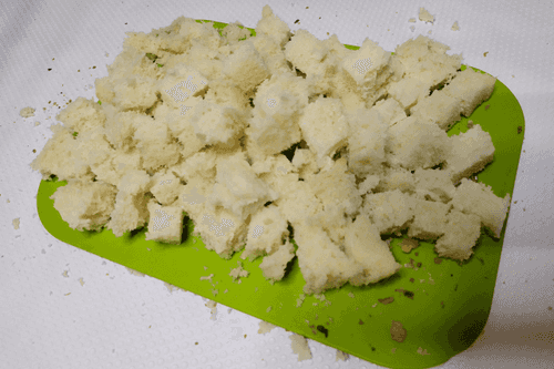 Срезать с хлеба корочку и нарезать кубиками со стороной 1 см.