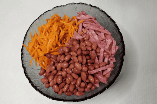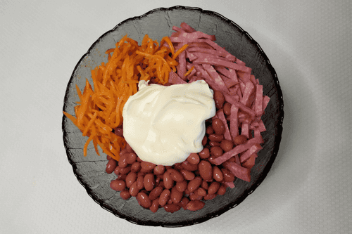 Этот европейский салат с колбасой, фасолью и сухариками — настоящая находка для любителей сытных, хрустящих и пикантных блюд. Его происхождение уходит корнями в домашнюю кухню, где практичность и насыщенные вкусы ценятся превыше всего. Нежный сервелат гармонично сочетается с пряной корейской морковью и мягкой красной фасолью, а хрустящие сухарики, пропитанные чесночным маслом, добавляют особый акцент. Заправленный майонезом, он приобретает кремовую текстуру, соединяя все ингредиенты в единое гастрономическое наслаждение. Этот салат не только удобен в приготовлении, но и прекрасно подходит как для повседневного меню, так и для праздничного застолья. Идеальный баланс вкусов делает его универсальным выбором для любителей насыщенных блюд.
