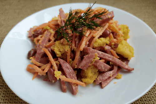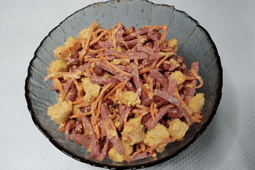 Соединить сухарики, колбасу, корейскую морковь и красную консервированную фасоль (с моркови и фасоли предварительно слить всю жидкость).