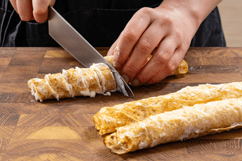 Распределить творожную смесь по блинчикам и свернуть их в рулеты. Убрать рулеты в холодильник на время, чтобы крем стабилизировался.