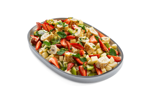 Фруктовый салат с блинами — это изысканное сочетание нежных блинных рулетиков и свежих фруктов, объединённых в гармоничную композицию русской кухни. Воздушный творожный крем с нотками ванили придаёт блюду мягкость, а сладкий мёд и лимонная заправка добавляют освежающую кислинку. Истоки этого блюда восходят к традициям домашней выпечки и любви к натуральным ингредиентам. Оно прекрасно подходит для утреннего завтрака, лёгкого десерта или угощения на праздничном столе. Яркие кусочки киви, клубники, яблок и груш не только радуют глаз, но и насыщают вкусом, создавая настоящий калейдоскоп свежести. Украшенная ароматной мятой, эта гастрономическая симфония объединяет классические мотивы и современный подход к приготовлению, даря каждому кусочку ощущение уюта и наслаждения.