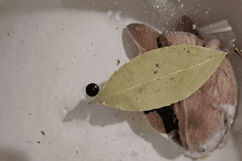 Выложить в кастрюлю 5 горошин душистого перца и 1 лавровый лист, посолить по вкусу, варить сердце до готовности примерно 40 минут, достать из бульона, остудить.