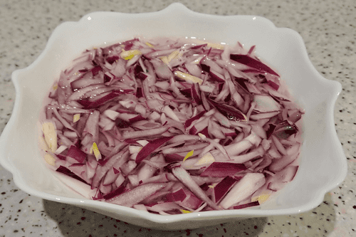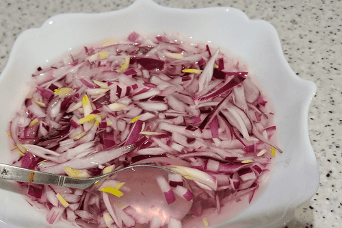 Добавить в емкость к нарезанному луку соль, уксус и воду. Хорошо перемешать.