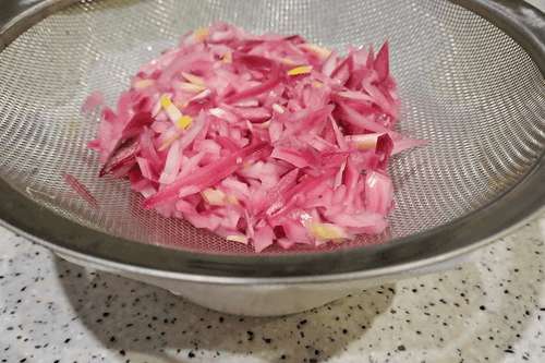 Маринованный лук откинуть на дуршлаг и немного отжать.
