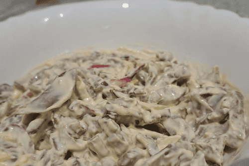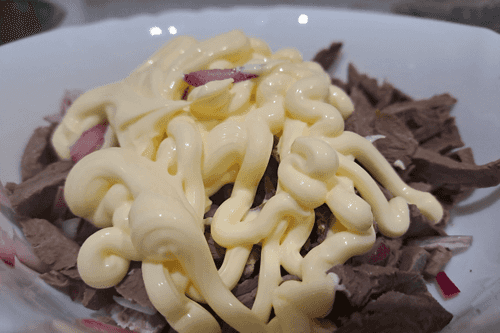 Выложить лук к нарезанному сердцу. Посолить и поперчить салат по вкусу, добавить майонез.