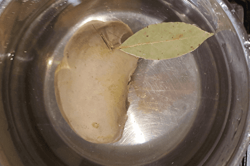Выложить в кастрюлю 5 горошин душистого перца и 1 лавровый лист, посолить по вкусу. Варить печень до готовности примерно 30 минут.