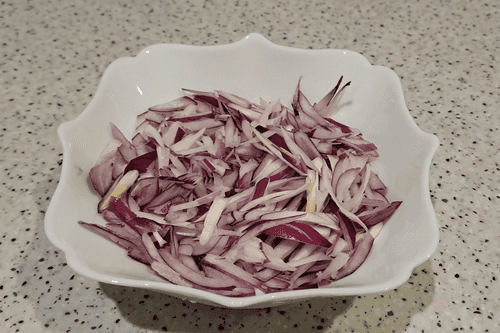 Лук очистить, хорошо вымыть, нарезать соломкой или полукольцами и выложить в отдельную емкость.