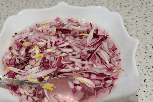 Выложить в емкость к нарезанному луку соль, уксус и воду. Хорошо перемешать.