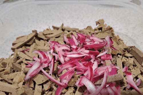 Очистить печень от пленки, убрать все лишнее. Нарезать тонкой соломкой. Маринованный лук откинуть на дуршлаг и немного отжать, выложить в емкость к нарезанной печени.