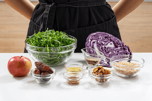 Смешать в салатнике отваренную полбу, руколу, яблоки, капусту, финики и орехи. Полить заправкой и перемешать.