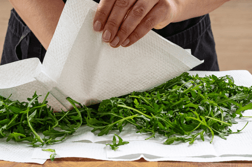 Промыть и обсушить руколу.