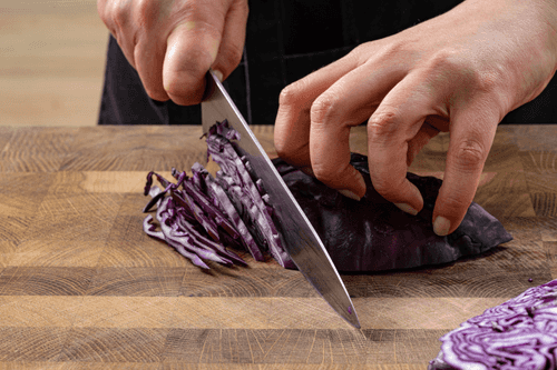 Нашинковать красную капусту тонкими полосками.