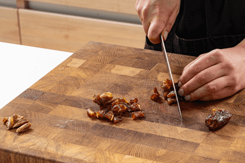 Финики избавить от косточек и нарезать небольшими кусочками.