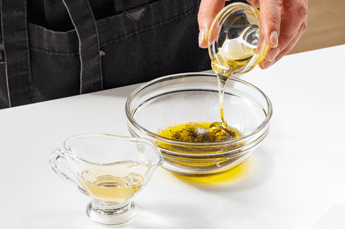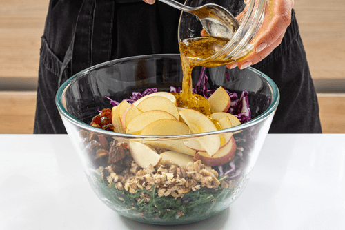 Для заправки смешать горчицу, уксус, оливковое масло и мед до однородности. Посолить и поперчить.