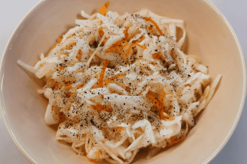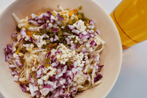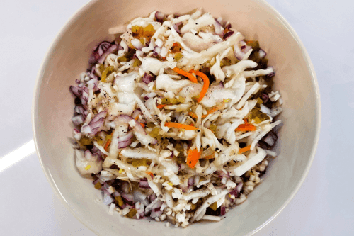 Этот салат из квашеной капусты — это сочетание яркости, остроты и насыщенного вкуса, которое пробуждает аппетит. Квашеная капуста придает блюду приятную кислинку, а сочетание чеснока, лука и халапеньо делает его пикантным и насыщенным. Это блюдо отлично подходит для зимнего времени, когда хочется чего-то бодрящего и витаминного. Истоки этого рецепта можно искать в восточноевропейской кухне, где капуста занимает важное место в рационе. Особая нотка придается подсолнечным нерафинированным маслом, которое раскрывает вкус ингредиентов. Такой салат можно подавать как самостоятельное блюдо или использовать как гарнир к мясным и рыбным угощениям. Простой, но выразительный, он идеально вписывается в авторский стиль кухни.