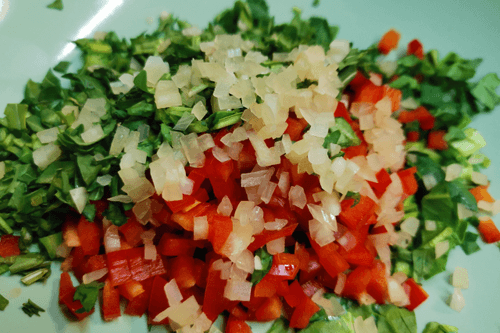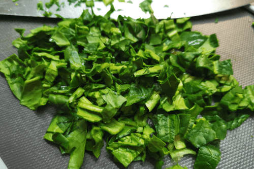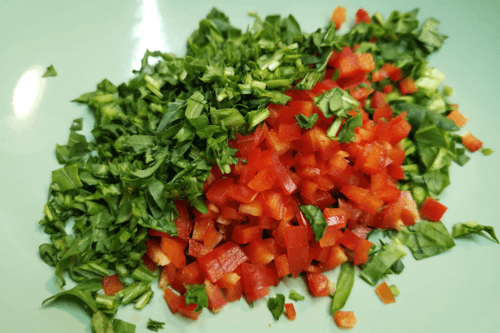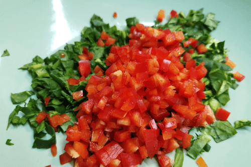 Перец нарезать мелким кубиком и объединить со шпинатом в глубокой миске.