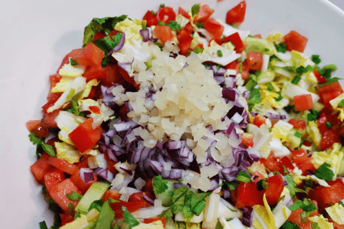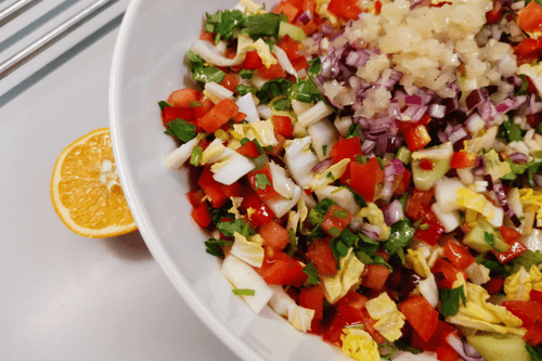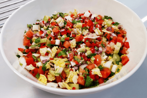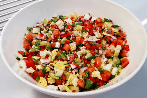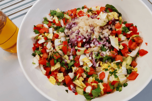 Салат с пекинской капустой — это легкое и освежающее блюдо, идеально подходящее для летних дней. Его корни уходят в европейскую кухню, где ценится баланс вкусов и текстур. Хрустящая пекинская капуста сочетается с сочными томатами, нежными огурцами и сладким перцем рамиро, создавая гармонию свежести. Добавление кинзы, зелёного и красного лука придаёт пикантность, а чеснок и маринованный чеснок добавляют глубину аромата. Заправленный ароматным подсолнечным маслом и лимонным соком, салат приобретает тонкую кислинку, подчеркивающую свежесть ингредиентов. Это универсальное блюдо подходит как гарнир к основным блюдам или как самостоятельный легкий ужин. Идеальный выбор для тех, кто хочет насладиться натуральным вкусом овощей!