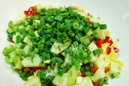 Огурцы очистить от кожуры и некрупно нарезать. Перец и капусту нарезать мелко. Объединить в глубокой миске.