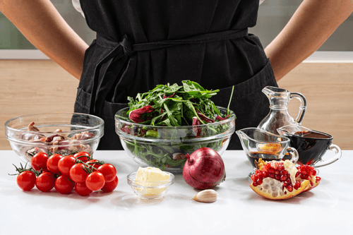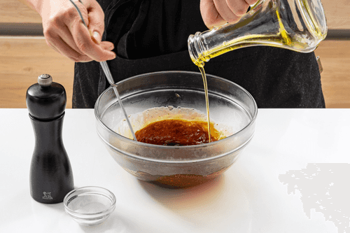Добавить в миску бальзамический уксус и взбить, тонкой струйкой вливая оливковое масло. Попробовать соус и добавить соли и перца по вкусу.