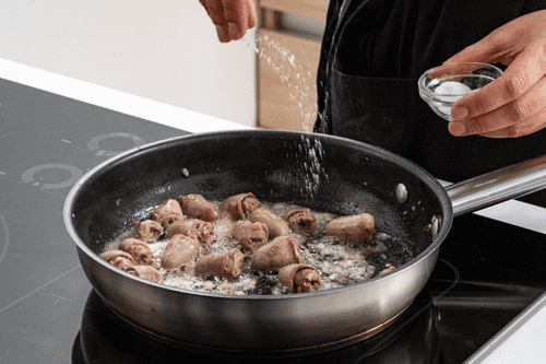 Добавить сердечки и обжаривать, помешивая, до изменения цвета. Посолить.
