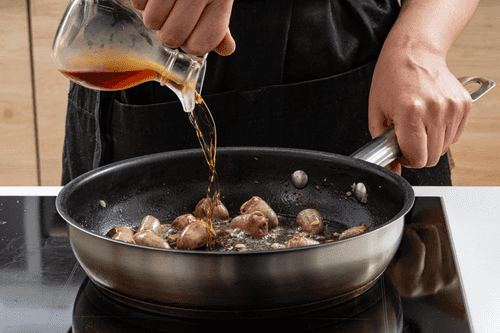 Влить коньяк и жарить еще 2 минуты. Затем переложить сердечки в чистую посуду и накрыть фольгой, чтобы они не остывали.