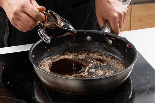 В сковороду, где жарились сердечки, влить наршараб, перемешать и довести до кипения. Затем перелить содержимое сковороды в глубокую миску.