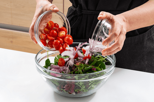 Получившуюся заправку смешать с салатными листьями, луком и помидорами черри.