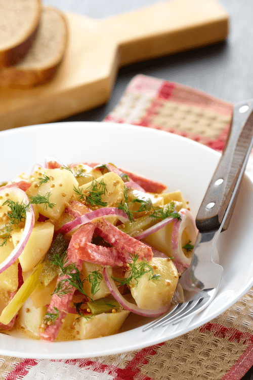 Картофельный салат с карамелизованным луком и лимонным майонезом