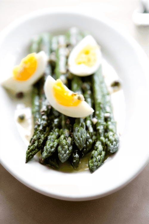 Зеленая спаржа с перепелиными яйцами, сельдереем и эстрагоном