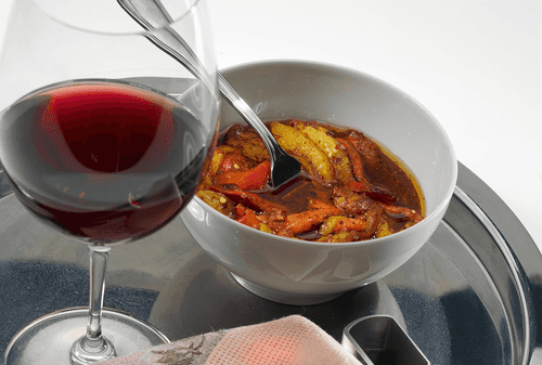 Запеченные перцы надо извлечь из духовки, остудить до той степени, чтобы их можно было нарезать толстой лапшой. Нарезать лапшу из перцев и смешать ее с оливковым маслом, хересным уксусом, мелко нарубленной петрушкой, давленым чесноком и цельными листьями зеленого базилика. Посолить, поперчить, перемешать еще раз, дать настояться некоторое время и подавать. Хорошо — с хрустящими сухариками, обжаренными в растительном масле.