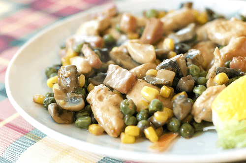 Куриный салат с грибами и зеленым горошком — это изысканное блюдо европейской кухни, которое сочетает в себе нежность куриного филе, сочность грибов и сладковатую нотку консервированного горошка. Его можно считать современным вариантом традиционных мясных салатов, украшающих праздничные столы. Заправка из сметаны, майонеза и кетчупа придаёт салату насыщенный, слегка пикантный вкус, гармонично дополняемый ароматом свежей петрушки. Грибы обжариваются до золотистости, усиливая глубину вкуса. Этот салат отлично подойдёт как самостоятельное блюдо или в качестве дополнения к основному меню. Он универсален — его можно подать на ужин в кругу семьи или удивить гостей на торжественном мероприятии. Лёгкий в приготовлении, но элегантный в подаче, он дарит наслаждение с каждым кусочком.