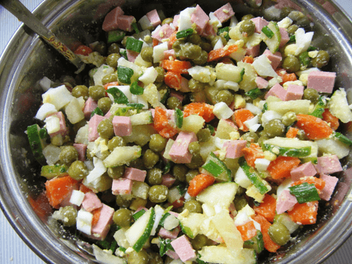 Салат оливье с мясом и свежими огурцами
