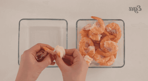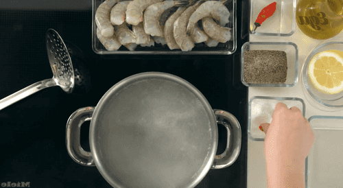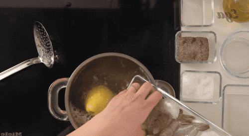 Для креветок: Довести до кипения сильно соленую воду с красным и черным перцем, оливковым маслом и половинкой лимона ( сок предварительно выжать в воду).
