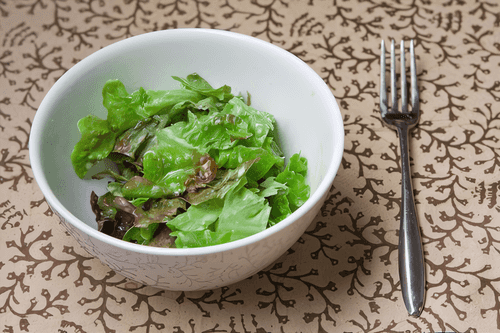 Добавьте листья салатов и хорошо перемешайте. Подавайте немедленно.