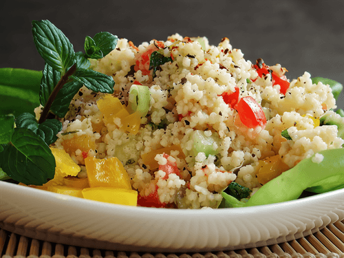 В большой миске смешать кускус, овощи, травы, масло и винный уксус, посолить и поперчить, добавить специи по вкусу, украсить блюдо свежей мятой.