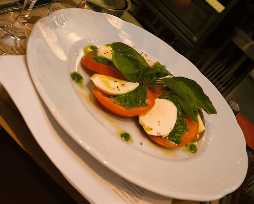 Сыр моцарелла и сладкие томаты, нарезанные ломтиками, выкладываются поочередно на тарелку, сбрызгиваются 5-ю граммами оливкового масла, по краям поливаются соусом «Песто из базилика» и посыпаются черным дробленым перцем и морской солью. Украшается веточкой свежего базилика.