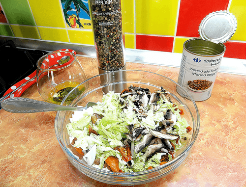 Сбрызнуть заправкой и аккуратно перемешать.