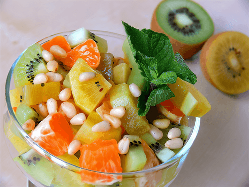 Смешайте мед с лимонным соком, можно добавить корицу. Заправьте соусом фрукты, пермешайте.