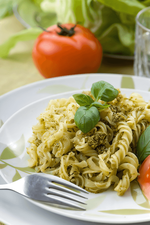 В большой миске смешайте песто с йогуртом, затем добавьте холодную пасту и перемешайте. Добавьте порезанные по вкусу помидоры, посолите и поперчите по вкусу.
