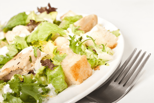 Салат из куриной печени с чесночными сухариками