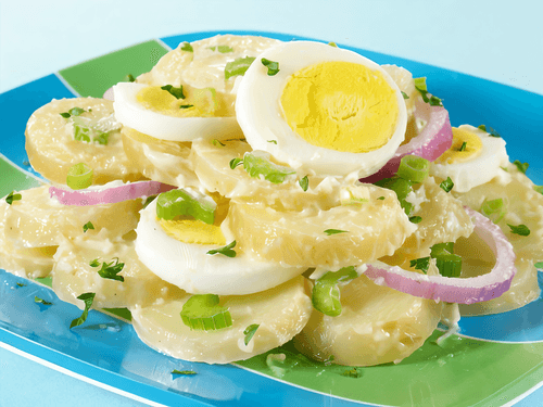 Соединить картофель с зеленью, луком и яйцами. Заправить салат сливочным соусом. Для приготовления соуса соединить сливки с горчицей, оливковым маслом и винным уксусом. Добавить соль и перец.