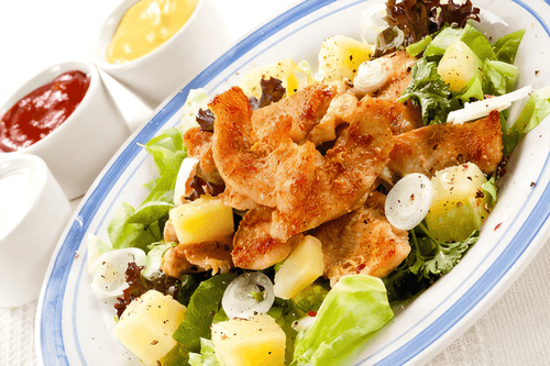 Салат из курицы с овощами под томатным соусом — это яркое и насыщенное блюдо русской кухни, сочетающее нежность курицы с хрустящими овощами и пикантным томатным соусом. Его корни уходят в традиции домашней кухни, где простые, но сытные ингредиенты создают гармонию вкусов. Заправка из томатной пасты с майонезом придаёт салату лёгкую кислинку и кремовую текстуру, делая его особенно аппетитным. Этот салат идеально подходит как для повседневных обедов, так и для праздничного застолья, прекрасно сочетается с мясными блюдами и свежим хлебом. Каждый ингредиент добавляет свой оттенок — отварная курица даёт мягкость, хрустящий картофель — плотность, свежий огурец — освежающий вкус, а яйца придают насыщенность. Это блюдо не только питательно, но и очень эстетично, радуя глаз своей структурой и цветовой гаммой.