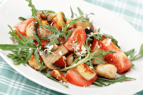 Перемешайте листья салата, мясо цыпленка, грибы, помидоры черри. Майонезную смесь равномерно распределите по салату, закройте плотно крышкой и поставьте в холодильник на 4 часа.