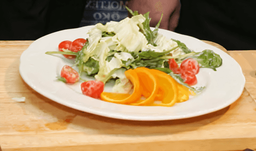Украсьте салат апельсиновыми дольками и лепестками мяты.