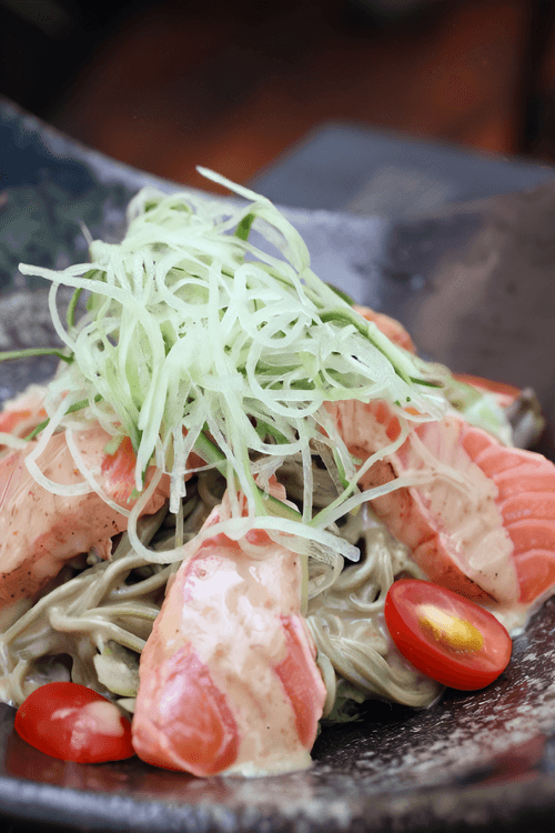 Теплый салат из гречневой лапши с помидорами и лососем – это гармоничное сочетание японской элегантности и европейской кулинарной изысканности. Лапша соба, известная своим ореховым вкусом, нежно обволакивает ароматные помидоры, пропитанные соусом терияки. Лосось добавляет нежность и насыщенность, а твердый сыр придаёт глубину вкусу. Петрушка освежает блюдо, создавая тонкий баланс между сладостью и солёностью ингредиентов. Этот салат идеально подходит для лёгкого ужина или обеда, сохраняя питательность, но не перегружая организм. Он хорошо сочетается с белым вином или зелёным чаем, а его презентация радует глаз: яркие цвета, аппетитная текстура и тонкий аромат. Каждая ложка наполнена богатством вкусов, делая этот рецепт настоящим гастрономическим наслаждением.