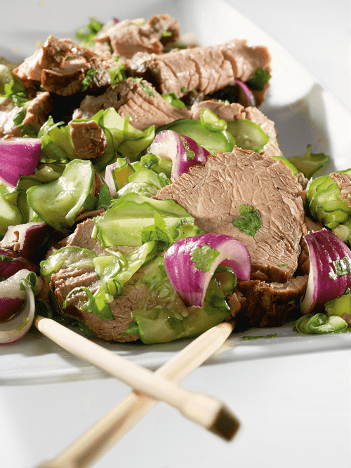 Это один из самых популярных салатов тайской кухни. Главная особенность заключается в его заправке. Сначала мясо запекается и нарезается на тонкие ломтики. Затем к нему добавляются лук и листья салата. Огурцы предварительно маринуются в специальной смеси, которая состоит из соевого и рыбного соусов, рисового уксуса, пальмового сахара и ароматных кореней. Этот насыщенный маринад придаёт блюду неповторимый вкус.