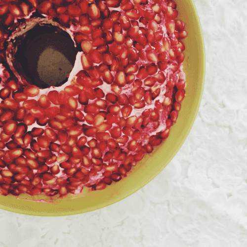 Вынуть стаканчик и сверху салат хорошо обмазать майонезом. Всю поверхность салата покрыть зернами граната.