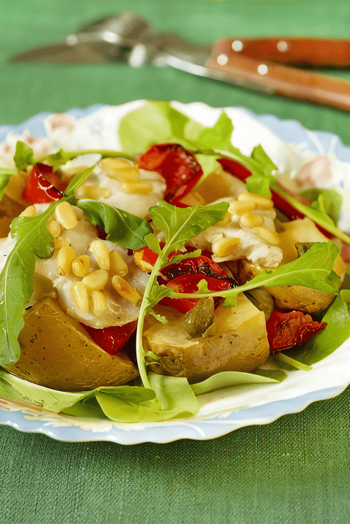 Этот салат из копченой рыбы с картофелем и каперсами — воплощение русского вкуса, сочетающего в себе насыщенность копчёного филе, нежность картофеля и пикантность каперсов. Рыба горячего копчения придаёт блюду яркий аромат, а сочные помидоры дополняют его свежестью. Заправка на основе майонеза, апельсинового сока и винного уксуса добавляет легкую кислинку, делая вкус сбалансированным. Исторически подобные салаты готовили в русской кухне для праздничных застолий, ценя их за гармоничное сочетание продуктов и питательность. Этот салат отлично подойдет как самостоятельное блюдо или в качестве закуски на семейном ужине, а его насыщенный и многослойный вкус оставит незабываемые впечатления.